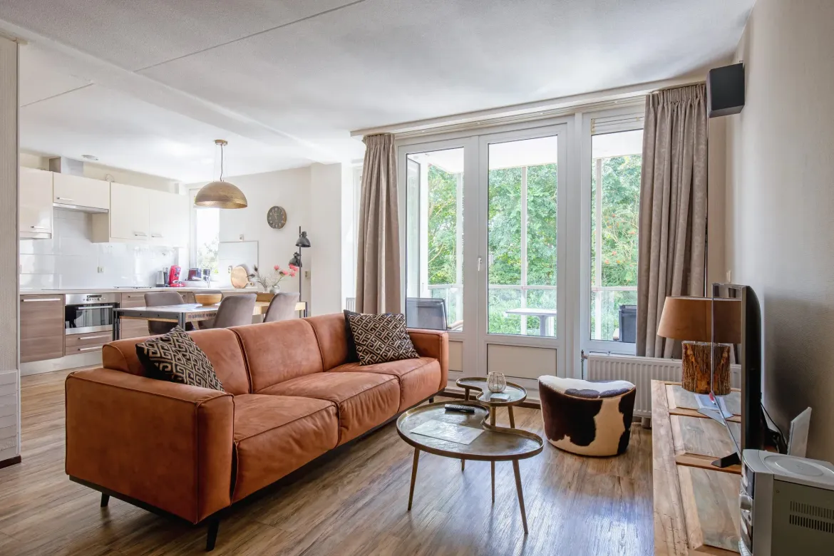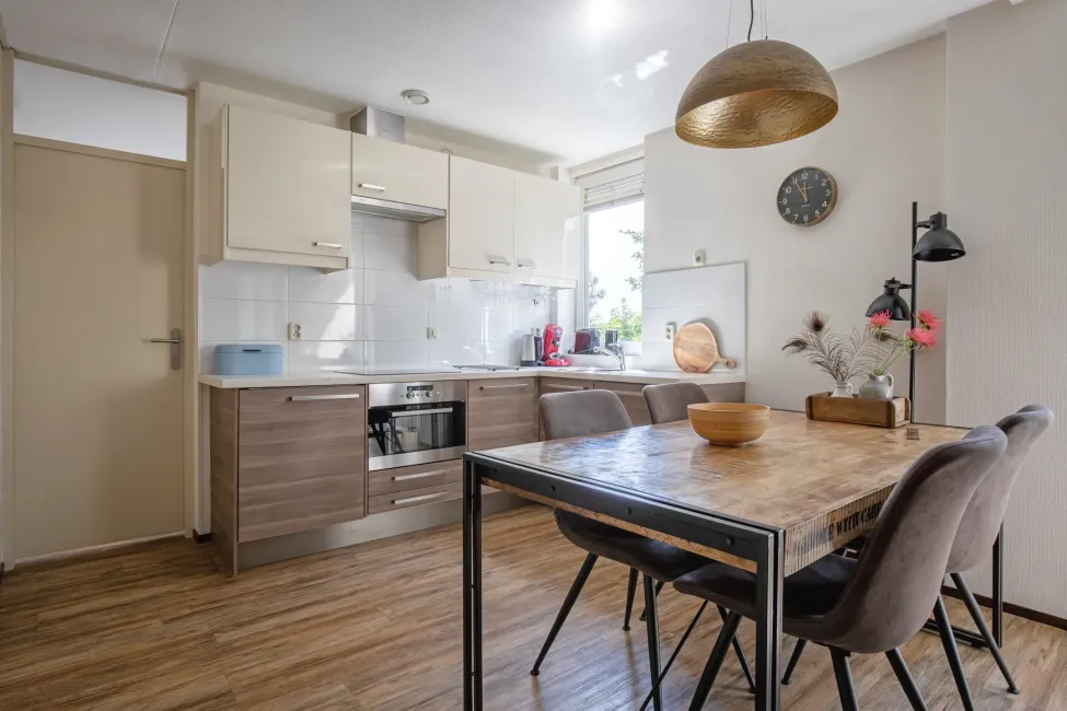 De woonkamer is een lichte en sfeervolle ruimte waar je heerlijk kunt ontspannen na een dag op het strand of in de duinen. De comfortabele zithoek met smart-tv nodigt uit voor een ontspannen avond, terwijl de eethoek ruimte biedt voor gezellige maaltijden of een spelletje samen. Dankzij de grote ramen en het directe toegang tot het balkon geniet je volop van het Texelse buitengevoel, ook binnen.